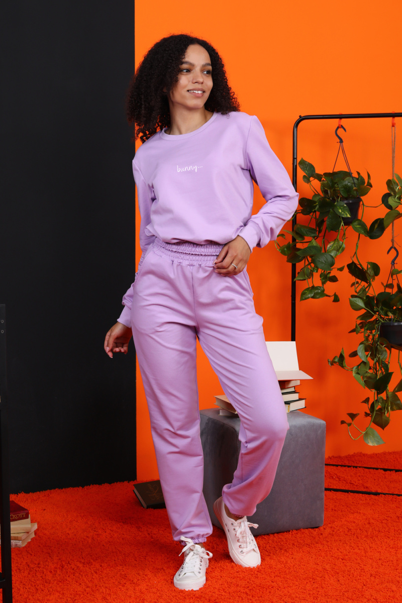 Костюм женский для повседневной носки. Данная модель выполнена из трикотажного полотна футер 2-х нитка. Толстовка с втачным рукавом. На полочке присутствует маленьким принт. Манжеты на рукавах и горловина выполнены из эластичного трикотажного полотна кашкорсе. Пояс на толстовке и брюках выполнены из основной ткани под поясную машинку (отделочная тройная строчка). Брюки имеют по бокам карманы, принт на задней детали. По низу брюк вшита резинка 2,5 см.